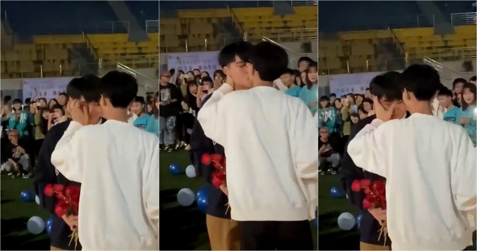 某大学操场,两男生表白现场的!